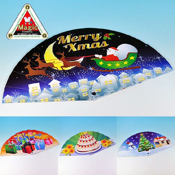 やさしくて効果満点と好評の「DPG ストーリーファン」シリーズのクリスマスバージョンです。ファン(扇)には、たくさんのプレゼントが山のように…一体何だろう?次にファンを開くと、大きなケーキの絵に変わります。さらに、雪だるまとカラフルに飾られたツリーの絵に!最後はそりに乗って街を飛ぶサンタクロースが出てきて「メリークリスマス!」となります。子供から大人まで興味津々!「何だろう?何だろう?」とあなたのマジックに引き込んでしまう、クリスマスのショーにはぜひご利用頂きたいマジックです。「DPGブラックアート」(K7001)、「DPG マイマウス(R) ボックス」(K6361)等、お好きな取り出し用具を使い、広げたファンで扇いで魔法をかけてから、プレゼントを出現させるといった演出も素敵です。 説明書には詳しい演じ方はもちろん、簡単で短時間に組み立てができる新アイディアの方法が解説してあります。「サンタからのクリスマスカード」(C2945)等と合わせて演じるのも効果的です。また、「上口龍生の「DPG ストーリーファン」解説DVD」(B7131)でも作り方、演じ方を解説しています。