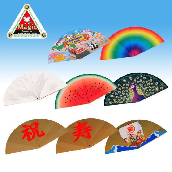 今回発売された「DPG ストーリーファン」の全部が入った、たいへんお買い得なセットです。内容は、「色」(K5170)・「慶賀/寿」(K5171)・「慶賀/祝」(K5172)・「慶賀/宝船」(K5173)・「果物」(K5178)・「鳥」(K5180)・「空」(K5182)・「遊園地」(K5184)です。詳細はそれぞれの欄をご覧下さい。「DPG ストーリーファン」の大きさ(広げると幅 50 cm 近く)や手順は、どの製品も一緒です。(内容や演出方法だけが若干異なります。)また、「DPG ストーリーファン」(図柄の変化)は、どれもその大きな効果の割に、僅かな練習でマスターできるところが特徴です。そして、この8種類入ったセットは、色々なバリエーションがあり、観客あるいは、TPOに応じてたいへん効果的に演じることができるにもかかわらず、全く同じ手順でできてしまうのです。もちろん、「簡単に組み立てられる新アイディアの方法」を使えば2つ目のファンからは、さらにやさしく、楽しく、組み立てることができます。また、「上口龍生の「DPG ストーリーファン」解説DVD」(B7131)でも作り方、演じ方を解説しています。(組立式)