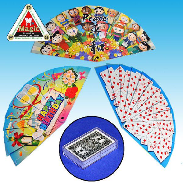 ファンの全面の絵を変化させることができるフラップのアイディアを盛り込んだ「カラーチェンジ ファン」の集大成!広げると50cm近い大型のファンは「DPGストーリーファン」の名称で8種類発売し、大人気となりました。そこで、扇(ファン)に描かれたトランプ模様が次々と変化してお客様のトランプを当てる「DPG ストーリーファン(トランプ)/特製トランプ付」(K5186)。ファンに描かれたプレゼントがケーキに、次は赤ちゃんを運ぶコウノトリに、最後は誕生日の風景になる「DPG ストーリーファン(バースデー)」(K5190)。ファンの富士山が芸者に、次はハイテクの絵に!最後は世界の人が手をつないで平和をアピールした「DPG ストーリーファン(日本)」(K5191)の3種類のセットを超お買い得価格でお届けします。「スートリーファン」は単に図柄が変化するだけでなく、そこにストーリーが融合した作品です。ファンの扱い方は全て同じですから、TPOに合わせて演じて下さい。また、「上口龍生の「DPG ストーリーファン」解説DVD」(B7131)でも作り方、演じ方を解説しています。