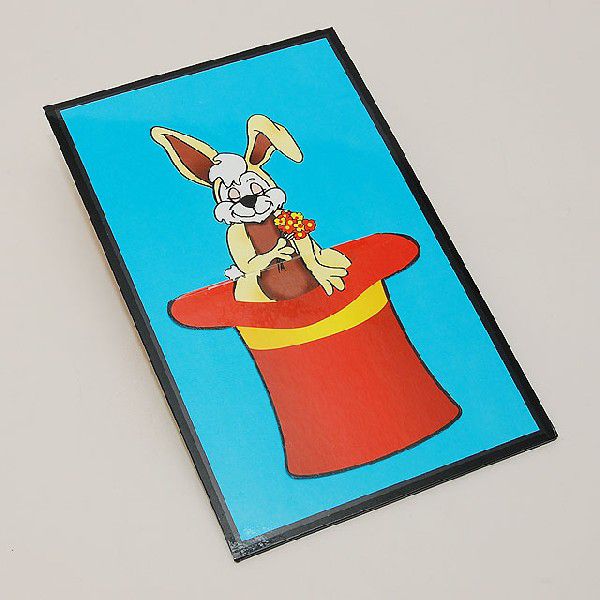 パーティ、サロン向きのとっても手軽で、わかりやすい演技のカードボードトリックです。縦30cm・横19cmのボードには、ブルーのバックに赤いシルクハットが描かれています。そこで、ボードをいったん裏に向けて、魔法をかけるジェスチャーをします。ボードに「紙フブキ」(P5106他)をかけたり、ウォンドを振ったり等、何でも結構です。そしてボードを表向けると、描かれたシルクハットの中から、かわいい花を持ったウサギが顔を出しているのです。反対に、シルクハットに入っているウサギを消してしまうこともできます。現象のハッキリしたやさしくてかわいいトリックですから、女性やお年寄りの方、小さなお子様でも簡単に演じることができます。ボードは紙製ですが、表面をビニールコーした厚さ4mmのたいへん丈夫なものを使用していますから軽くて耐久性もあり、持ち運びも簡単です。<さらに優れた演出の手順が演じられる大型の製品に「新 魅惑の絵画(ラブラブローズ)/(花満開)」(K7234/K7236)もあります>
