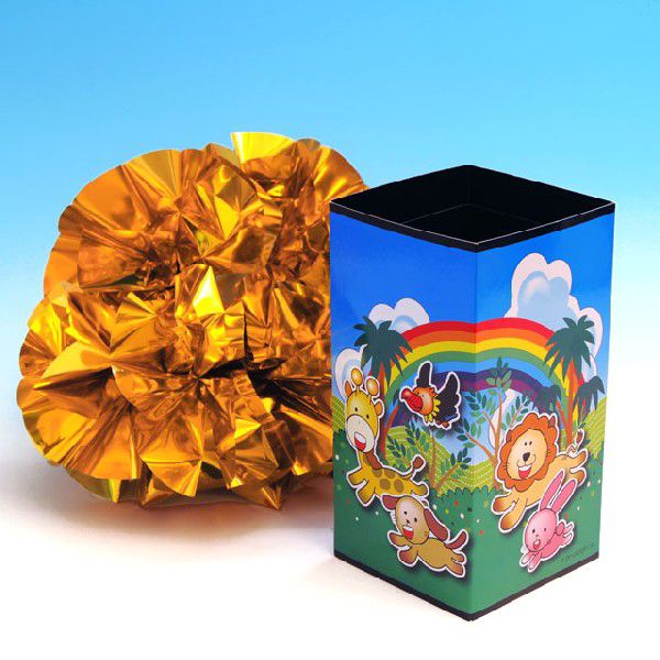 キリンやライオン、ウサギ、インコ等の動物が、真っ青な空に雲と虹のかかった森の中を楽しそうに駆けている。お子様相手のショーにもピッタリのイラストが周囲に描かれた「プロダクションチューブ(動物ランド Ver.)」(K6336)ですが、それにメタルシートを使用した極薄バネ花を10枚まとめた、特製「楠玉」を1個<「メタルカラー楠玉 C10」(P542X)、または、「メタルカラー楠玉 D10」(P531X)>を付けたお買い得セットです。このセットをお求めになれば、とりあえず取り出し用品が無くてもすぐに演じられます。製品の内容については「プロダクションチューブ(動物ランドVer.)」をご覧下さい。もちろん、付属の「楠玉」にプラスして、マジック用のシルクや「万国旗」(S5113他)、「のべシルク」(S9511他)、各種「プリントシルク」(S3662他)、「ミリオンフラワー」(P5507他)、「紙吹雪」(P2145他)等をご利用になるとより華やかな演技がお楽しみいただけます。(「メタルカラー楠玉」以外の取り出し用品は別売/付属の楠玉の色は製品によって異なります)