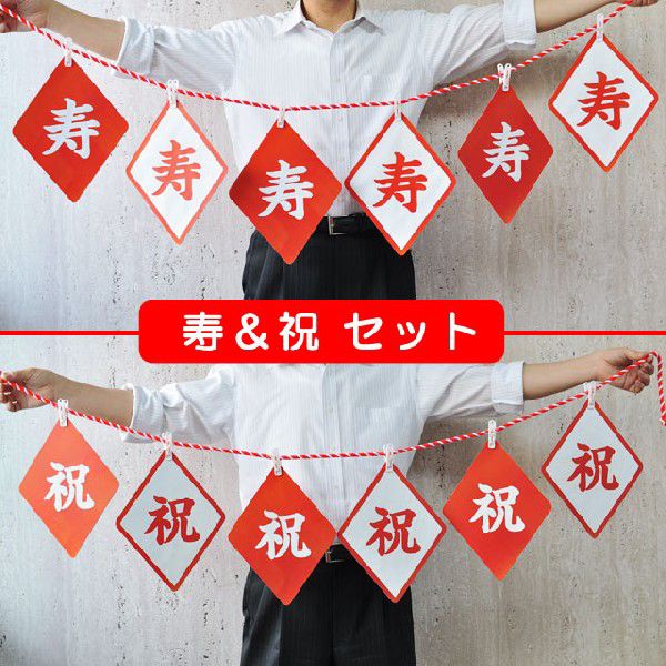 「紅白慶賀カード」を、結婚式の披露宴・お正月に適した「寿」と、祝い事全般に利用できる「祝」をセットにしてお求めやすい価格でご案内いたします。その演技は、菱形にカットされた3枚の両面とも赤いカードと、3枚の両面とも白いカードを、紅白編み上げの特製ロープに左右に赤と白を分けて吊します。すると次の瞬間、カードは赤と白が交互に入れ替わってしまいます。<詳しくは「紅白慶賀カード」の「寿」(K7214)または「祝」(K7216)の欄をご覧ください。>「松竹梅」(P7921/P7923)や「寿リング」(P7711)、「新 松竹梅カード」(C6924)等とともに慶賀の席で演じるのに最適なトリックです。今回は、いかなる祝いの席にも対応できるように、「寿」・「祝」をセットにしてお買い得価格でお届けいたします。(「寿」カード6枚・「祝」カード6枚・特製紅白ロープ1本のセットです。)別途、ご家庭で使用している、ごく普通の洗濯ばさみ(ランドリーピンチ)6個が必要です(お持ちでない方は、ホームセンターや 100円ショップで数個まとめて100から200円程度で入手できます。)