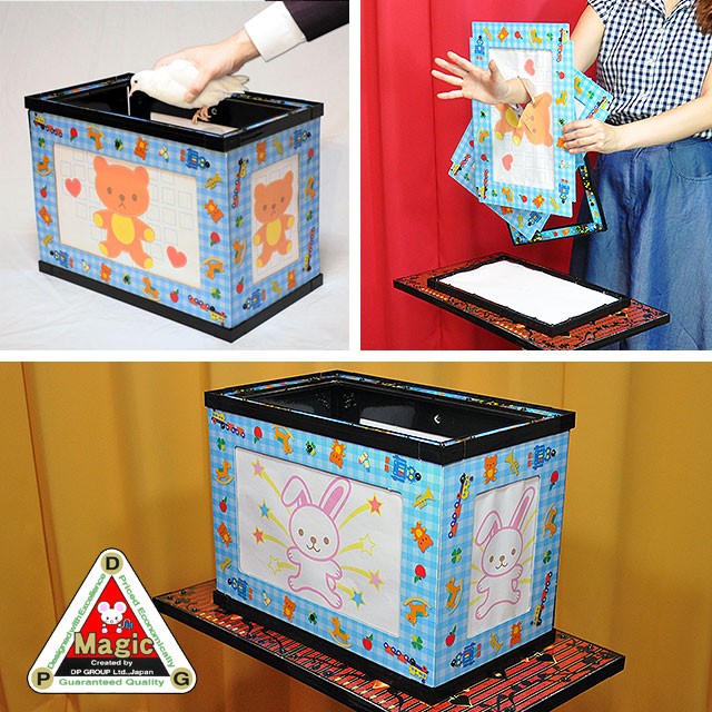 「打消箱」は従来非常に高価な製品です。今回は、DPGシリーズの数々の製品の中でも、特に超特価でお届けすることにこだわりました。しかも、デザイン性と軽量化を開発の目的に追加したため、スピード感を持って演技を進めることができるのです。そこで、枠の周囲に貼る紙(新聞紙等を使用して破る紙の部分)を、「DPG 打消箱(トーイ)」(K7420)のデザインにピッタリ合うようにデザインした、専用紙「ウサギ」(K7420P)と「テディベア」(K7420Q)の2種類(各5回分、計10回分)を付属したのがこのセットです。紙はカットラインも印刷してあるので、セットも素早く完了します。製品の演技等については「DPG 打消箱(トーイ)」の欄を参照して下さい。尚、関連製品として、「DPG 打消箱(マジシャン)」(K7410)・「DPG 打消箱用 デザイン紙(ハト/トップハット)」(K7410P/K7410Q)・「DPG 打消箱(マジシャン)デザイン紙付セット」(K7411)・「DPG 打消箱(フルセット)」(K7430)がございます。(組立式=接着剤付き)