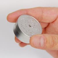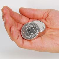 「私は何十ものコインボックスを収集してきましたが、こんなに美しい製品は見たことがありません。もっと言えば、マジシャンではなくデザイナーの手で、このトリックが、かくも美しく洗練された(用具というよりも)演技に生まれ変わることを実感しました。」このマジック研究家の言葉がこの用具の全てを物語っています。しかも、このコンセプトはコインボックスにとどまりません。次々と発売されている「プレミアムメタル」シリーズは、マジック用具の歴史に輝いて残ることでしょう。もちろん、美しいばかりでなく、コインボックス(コインの消失・貫通・移動・変化等)本来の技法も心地よくスムーズに演じられます。そして、その通常のメッキよりもずっと高価な艶消しシルバー(銀色)タイプを、化粧箱(新パッケージ)入りで、パーミングコイン(ゴールド)4枚付きでお届けします。説明書には基本から高度なテクニックまでを、多数のイラストを使って分かりやすく解説してあります。また、別売で上口龍生師の「PM コインボックス解説DVD」(B4111)もお薦めです。<他に 重厚な「カッパー(銅色)」(M7113)もあります>