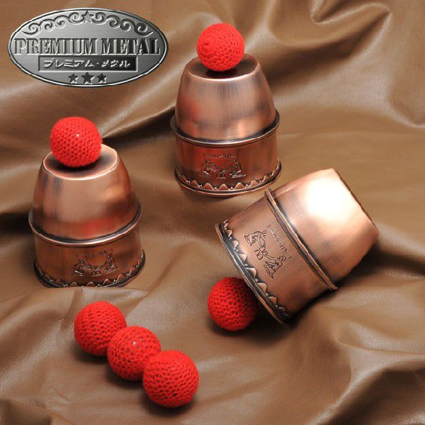 「PM(プレミアム・メタル)シリーズ」の重鎮「PM カップ&ボール(銅)」(M8711)と「PMチョップカップ(銅)」(M8731)を組み合わせた、これ以上ないほど贅沢な製品です。デザインは上記と同じで、3つカップ(外側が銅色で内側が黒色)のうち1個は「チョップカップ」用となっています。ニットボールは、「カップ&ボール」用と「チョップカップ」用の合計6個(直径26 mm)が付属していますので、この3つのカップだけで、どちらの手順もできます。そして、これらが組み合わさったことで、その手順は、あなたのアイディア次第で、何倍にも不思議な素晴らしいものに広がることでしょう。カップの素晴らしさについては、「PM カップ&ボール」と「PMチョップカップ」の解説を参考にして下さい。「PM コンビネーション カップ&ボール」は、他にも、オーソドックスな銀(M8752)、豪華な金(M8753)がございます。「カップ&ボール」「チョップカップ」に必要な全ての説明書が付属しています。<持ち運びには、チョップカップのテーブルマットとしても使える「PM カップ用 ポーチ」(L8710)をお薦めします。>
