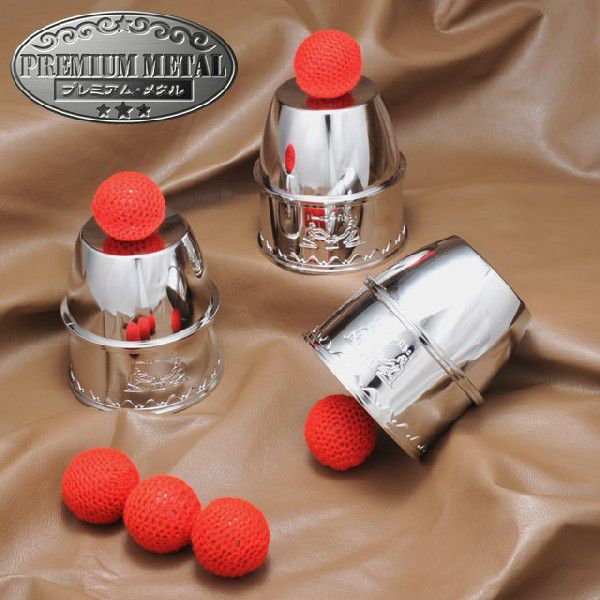 PM(プレミアム・メタル)シリーズ」の重鎮「PM カップ&ボール(銀)」(M8712)と「PMチョップカップ(銀)」(M8732)を組み合わせた、これ以上ないほど贅沢な製品です。デザインは上記と同じで、3つカップのうち1個は「チョップカップ」用となっています。ニットボールは、「カップ&ボール」用と「チョップカップ」用の合計6個(直径26 mm)が付属していますので、この3つのカップだけで、どちらの手順もできます。そして、これらが組み合わさったことで、その手順は、あなたのアイディア次第で、何倍にも不思議な素晴らしいものに広がることでしょう。カップの素晴らしさについては、「PM カップ&ボール」と「PMチョップカップ」の解説を参考にして下さい。「PM コンビネーション カップ&ボール」は、他にも、銅色で内側が黒色の銅(M8751)、豪華な金(M8753)がございます。「カップ&ボール」「チョップカップ」に必要な全ての説明書が付属しています。<持ち運びには、チョップカップのテーブルマットとしても使える「PM カップ用 ポーチ」(L8710)をお薦めします。>