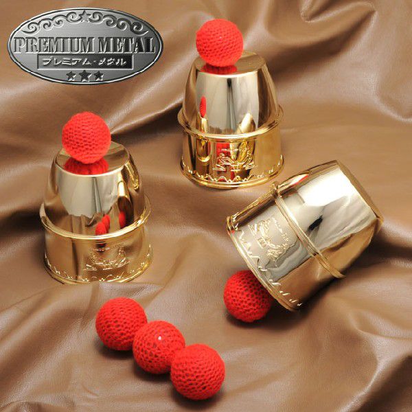 「PM(プレミアム・メタル)シリーズ」の重鎮「PM カップ&ボール(金)」(M8713)と「PMチョップカップ(金)」(M8733)を組み合わせた、これ以上ないほど贅沢な製品です。デザインは上記と同じで、3つカップのうち1個は「チョップカップ」用となっています。ニットボールは、「カップ&ボール」用と「チョップカップ」用の合計6個(直径26 mm)が付属していますので、この3つのカップだけで、どちらの手順もできます。そして、これらが組み合わさったことで、その手順は、あなたのアイディア次第で、何倍にも不思議な素晴らしいものに広がることでしょう。カップの素晴らしさについては、「PM カップ&ボール」と「PMチョップカップ」の解説を参考にして下さい。「PM コンビネーション カップ&ボール」は、他にも、銅色で内側が黒色の銅(M8751)、オーソドックスな銀(M8752)がございます。「カップ&ボール」「チョップカップ」に必要な全ての説明書が付属しています。<持ち運びには、チョップカップのテーブルマットとしても使える「PM カップ用 ポーチ」(L8710)をお薦めします。>