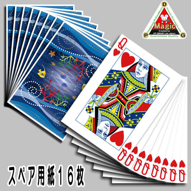 「DPGドデカード復活(ダブルショック)」(P7742)並びに「DPG ドデカードの復活(トリプルショック)」(P7745)、それに「復活するクィーン」(P7755)に使用できる予備のジャイアントカードシートです。「DPGドデカードの復活」は、4つ折りに畳んだカードシートの中央にあたる部分を三角形に切り取り、切った部分をカードシートのすき間に入れると、切り取ったはずの中央部分が元に戻るマジックです。また「復活するクィーン」は、32枚に細かく破いたカードシートが元の1枚のシートに復活します。(より詳しい内容は各製品の欄をお読みください。)このようにシートを破いてしまいますから、実際は、シートは1回演じるごとに消耗してしまいます。そこで、グラデーションを使用した、海をイメージしたオーシャンバックのたいへんきれいなバックデザインの、超特大ハートのクイーンの専用カードシート(A2サイズ)を16枚セットにして、上記の製品をすでにお持ちの方にお届けします。-(スペア品なので説明書は付いていませんし、購入ガイドもありません)