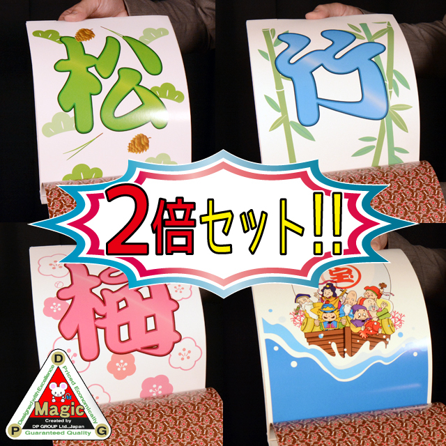 まず、「DPG 激!松竹梅」(P7923)の欄をご覧下さい。先の製品はA4に近いサイズの白紙 10枚、松・竹・梅・松(絵付)・竹(絵付)・梅(絵付)・宝船(大)・宝船(小)各5枚の計50枚セット(裏は、全部鶴と亀をあしらったデザイン)で、もちろん演技に必要な量となっています。一方、本製品は、好みに合わせて自由に綴れるので、例えば、もっと本の量感が欲しい。量を増やしてめくる順序を、前半は文字、後半は絵付文字の構成にしたい。従来の文字だけの「松竹梅」に…等々、色々なご要望に応じられる、お得な2倍セット(計100枚)です。どなたでも簡単に演じられますが、腕前が上がれば、この他に「紅白皿まわし」(J1117)、「ラブラブバッグ」(V1211)、「DPG ストーリーファン(慶賀/宝船)」(K5173)、「未来からのウェディングカード」(C2942)、「ウェディング ファンカード」(D1135)等々と組み合わせた1クラス上の演技をしたいですね。そんな時も持ち時間に合わせて、松竹梅の量や話の内容を変えられれば、もう初心者は卒業です。(組立式・校合用具付)