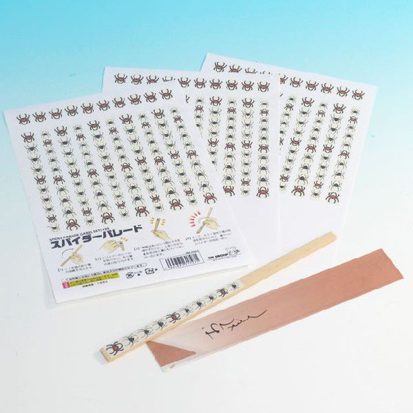 お酒の席やレストランでバカうけの小品トリック「ゴキブリパレード」(P9212)の姉妹品です。例えば、レストラン等でテーブルにおいてある割り箸を一膳取り、その両面をよく見せてから、一方の面の隅に一匹の蜘蛛のシールを貼ります。それから、箸の裏側を見せると、ナントそこにも蜘蛛が一匹付いていて蜘蛛は都合2匹になります。そこで「これは雄と雌のペアの蜘蛛です。この2匹はとても仲良しなので、すぐにたくさんの子供が生まれるのです。」と言いながら、割り箸をつまんで一振りします。すると、箸の一面に突然たくさんの蜘蛛が出現します。箸を握って、ひと撫ですると、再び蜘蛛は蜘蛛の子を散らすように一匹に… ところが、またまた蜘蛛はたくさんに増えてしまいます。最後はお友達の手の上にイミテーション蜘蛛<「恐怖のスパイダー」(I3224)や「特製ゼンマイ蜘蛛」(I8106A)を使用>を出して「ギャー!!」と驚かせてしまえば…。シール30回分セット。(写真の割り箸は付いていません)<別のデザインで「テントウ虫パレード」(P9216)もあります。また同じ原理で「プレミアムメタル」シリーズの製品に「PM 宝石の飛行」(M7232/M7234)もありますし、パドルムーブのやり方は「上口龍生の「PM 宝石の飛行」解説DVD」(B4113)が参考になります。>