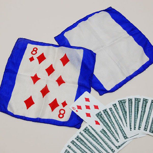 「カードシルク セット(ハートのQ)」(S4212)の別タイプです。プリントシルクの大きさ(約22cm角)も、トランプのデザインサイズも同じ(14cm×19cm)ですが、特に「MAGIC +1 プラ製ショッキングトランプ」(D1123)をお持ちの方に、抜群の効果があるよう、特別にダイヤの8をプリントいたしました。これにより、サムチップと併用して、ブランクシルクにダイヤの8が出現し、最後に何とトランプも全部ダイヤの8に変化してしまう超驚きのクライマックスも演出できます。もちろん、「スペードのA」タイプ同様、各種「チェンジングバッグ」(T5611他)・「カメレオンハンカチ」(S1111)・「プロフェッショナル ダイチューブ」(M5361)等との併用で、色々な演出ができますし、説明書には、「MAGIC +1 プラ製ショッキングトランプ」がなくてもできる、やさしいフォースのやり方も解説してあります。<「MAGIC+1 ショッキングトランプ」(写真のトランプ)や「チェンジングバッグ」 、「サムチップ」は別売。>