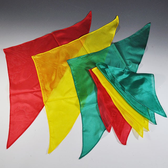皆様ご存じのように、マジシャンが極薄シルクを使用する理由は、演技が美しく見えるだけでなく、小さなスペースに入れられ、取り出した時もしわの付きにくい素材だからです。三角シルクは一見普通のシルクに見え、実は半分しかないのコンパクトサイズなので、例えば「サムチップ(大)」(U3818)からの出現・消失や、「DPGハンカチーフボール」(U2001A)からの多数の取り出し、「DPGサドン シルクタワー」(S7120)に等、使い途の応用範囲が広い便利なシルクです。にもかかわらず、今まで入手困難だったのは、極薄シルク素材を繊維に対して45度の角度でカットしたり、縫製することが極めて難しく、時間の掛かる作業となり、歩留まり率(不良品を除く良品の率)が悪いからです。今回届けするのは、約45 cm角シルクを対角にカットし、3カ所全ての縁を丁寧に縫製した赤・黄・緑を各2枚ずつ、計6枚のセットです。他に、「特上三角シルク 赤白各3/計6枚入(45cm角シルクイメージ)」(S8221) もございます。(使い方により全ての条件に適合しますので、「購入ガイド」はありません)