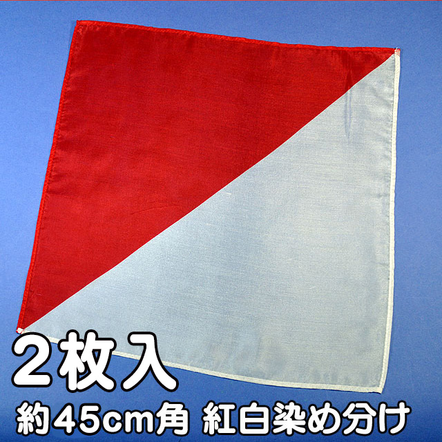 1/2ヤール(約45cm)角シルクを、対角に赤と白に染め分けた特製シルクを2枚セットでお分けします。結婚披露宴等では、赤と白のたくさんの小さなシルク(もしくは赤と白の大きなシルク1枚ずつ)を「チェンジングバッグ」(T5611他)に入れると、「紅白染め分けシルク」が連なって出現する…。「簡単 紅白20世紀シルク(特上品)」(S8251)を大きなシルクで演じたり、「特上 紅白シルク切り(約45cm角)」(S8653)の予備として…。「DPGバンゴーン」(P5943)で小さな赤と白のシルクがブレンドする…等々、皆様のアイデア次第で色々とご利用いただけます。表示のサイズは縫製前の平均的寸法を基準にしており、実際の寸法は表示寸法と数パーセントの誤差があることをご了承下さい。説明書は付いていません。(シルクは使い方により全ての条件に適合しますので、「購入ガイド」はありません)