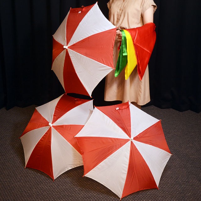 「プロダクション パラソル(紅白/3本セット)」(T2315)を簡単に取り出すための特製スカーフ3枚セットをお付けした、やさしく演じられてお買い得な製品です。マジシャンは、3枚の異なった色の大型スカーフを1枚ずつ改めてよく見せます。もちろんスカーフには何も怪しいところはありません。ところが、その3枚のスカーフの束から、直径80cmほどの紅白のパラソル(畳んだときの全長46cm)が、2本・3本と次々に出現するのです。パラソルは赤と白を交互に組み合わせた布を使用し、取り出した時すぐにワンタッチで開くプロダクション専用パラソル3本セットを使用しています。これなら、どんな大きなステージでも十分演じられますし、 しかもやさしくて強烈なインパクトがありますから、観客に感動を与える素敵なパラソルのプロダクションマジックとなることでしょう。用具は3本の取り出し用パラソルに3枚の大型スカーフ、それに特製ギミックのオール一式セットです。