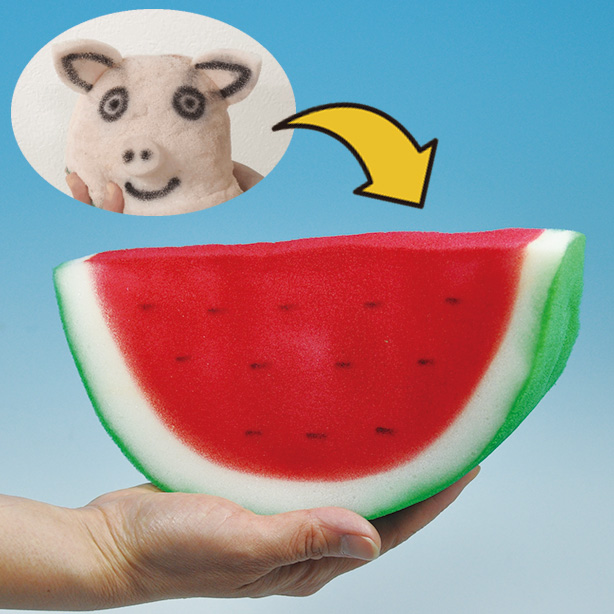 お子様相手のショーでも大ウケのゆかいなスポンジトリック!マジシャンは、スポンジ製のブタの頭(直径90mmくらい)を示します。それは、大きな耳があり、2つの目と鼻や口も付いています。他には何も持っていません。そこで、そのブタを両手で揉むようにして握り拳の中に押し込み、スイカをイメージしながら魔法をかけます。そして、ゆっくりと手を開くと、ナント!ブタの頭より何倍も大きなスイカの一切れ(幅220mm・高さ100mm)に変わってしまいます。特製のギミックスポンジは、1つずつ手作りされていて、ワンタッチでこの変化現象がおこなえます。もちろん難しいテクニックはいりません。また、「ストーリーファン(果物)」(K5178)に「DPGブラックアート」(K7001)と併用すれば、ファンで魔法をかけながらブラックアートから果物(イチゴ、バナナ、ブドウ)を取り出し、最後に本製品を出現させれば大爆笑となります。<似たトリックに「リンゴになるスポンジボール」(U6441)、「タマゴから孵るスポンジ亀」(U6405)、「ウサギになるスポンジボール」(U6408)等があります>手作り品のため、ブタの顔は製品ごとに異なります。