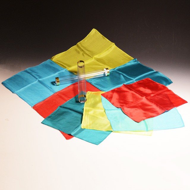 マジシャンは、長さ25cm、直径3.5cmほどの透明なチューブを見せます。チューブはお客様に渡して調べてもらうことができます。そして、チューブの中に青・赤・緑・黄色の4枚の1/3ヤール(約30cm)角シルクを押し込みます。もちろんチューブの外から、中に押し込んだシルクは透けて見えています。チューブに魔法を掛けてから、チューブの中のシルクを引き出すと、なんと!4枚のシルクがブレンドされて、大きな2/3ヤール(約60cm)角の「4色染め分けシルク」になってしまいます。従来の「ダイチューブ」(I5415/M5361/I7551他)や「ミラーチューブ」(V5697他)、「ネットチューブ」(N4111他)類と異なる、巧妙なアイデアのトリックで、全てがクリアーに演じられます。用具は必要なチューブとシルクが全て付属されています。