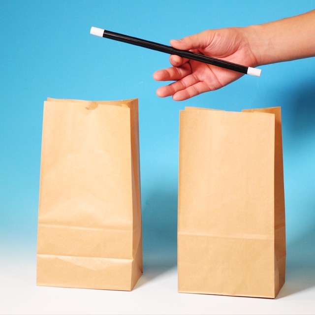 マジシャンは紙袋を広げて袋の中をお客様によく見せ、長さ27cmのプラスチック製「マジックウォンド」(魔法の杖)で袋の中に何も入っていないことを確認します。次に、もう1枚の紙袋を広げ、これもカラなことを改めてから、その中にウォンドを入れます。そして、カラの紙袋とウォンドを入れた紙袋を左右に離して置きます。魔法のジェスチャーをしてから、ウォンドが入っていた袋を小さく握りつぶします。27cmもあるウォンドは消えてしまいました!カラだった袋の中を見ると、ナント、そこにウォンドは飛び移っているのです。どなたでもやさしく演じられるクラシックなトリックですが、その効果は抜群です。用具は「マジックウォンド」のギミック約20回分(ギミックは消耗品)に、消失用の紙袋20枚が付いています。紙袋も消耗しますので、「3種の用具対応 消失用袋(20枚入)」(U5005P)<「DPG 泡わわビール瓶」(I7353)・「DPG 消えるビール瓶」(U5005/U5006)にも使えます>を合わせてのご購入がお勧めです。(ごく簡単な加工が必要です)