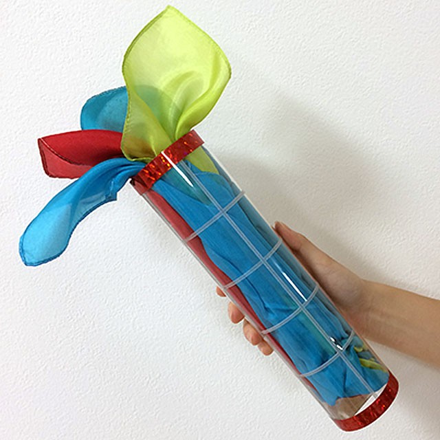 ステージでのアイテムの出現や変化に十分な威力を発揮する、アクリル製の透明チューブ(長さ25cm・直径6cm)です。その使い方は色々で、例えばカラのチューブ(筒)からシルクが出現したり、チューブにシルクを1枚だけ入れると数枚に増えたり、反対にチューブに入れたシルクが突然消えてしまったり…。また、赤と白のシルクが「特上 紅白タテ縞ヨコ縞シルク」(S5161)や「特上 紅白ストリーマー 」(S5175)、2枚の「紅白染め分けシルク(特上品)約45cm角(2枚入)」(S8612)、「デザインシルク祝(彩)/寿(彩)」(S8311/S8315/S8319)等々や、筒に入れた3枚のシルクの順番が一瞬で入れ替わったり、バラバラの4枚のシルクがブレンドして「4色染め分けシルク」(S3693)になったり…、このチューブに入るものなら何でも出現・消失・変化が自由に行えます。この用具は、1世紀以上を生き抜いたトリックで、ほとんどのマジシャン達が思っている以上に多用途に使用することができます。旧タイプのガラス製からアクリル製になって、丈夫でより使いやすくなりました。(取出用品/写真のシルクは別売)