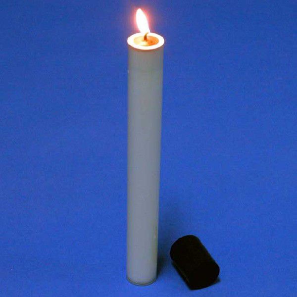 「これは面白い!」・「これは使える!」… そんな声が聞こえてきそうな今までにない現象のトリックです。 大きめのキャンドル(長さ24cm・直径28mm)に火を点け、観客に示します。そして、小さなキャップ(深さ41mm・直径31mm)をキャンドルに被せて火を消します。キャップを外すと、「おや!」キャンドルの先端がありません。そこでキャンドルを傾けると、ナント、そこからミルクが流れ出します。キャンドルはミルクのいっぱい詰まった透明な筒に変化してしまったではありませんか。あなたのお好みで、ミルクの代わりに塩や砂糖を使うこともできます。意外性に富んだクライマックスをもった、素早い、視覚効果抜群のトリックです。これは、他の演技の途中でも演じられますし、他の現象にキャンドルの火を使うことも可能です。また、出てきたミルクや塩等を使って、「DPG ミルクの消失」(G2501)や「DPG ミルクジョッキ」(G6381)、また「DPG マジック ソルトシェーカー」(I6383)、「塩の移動」(U3895)等のマジックと組み合わせるのも効果的です。