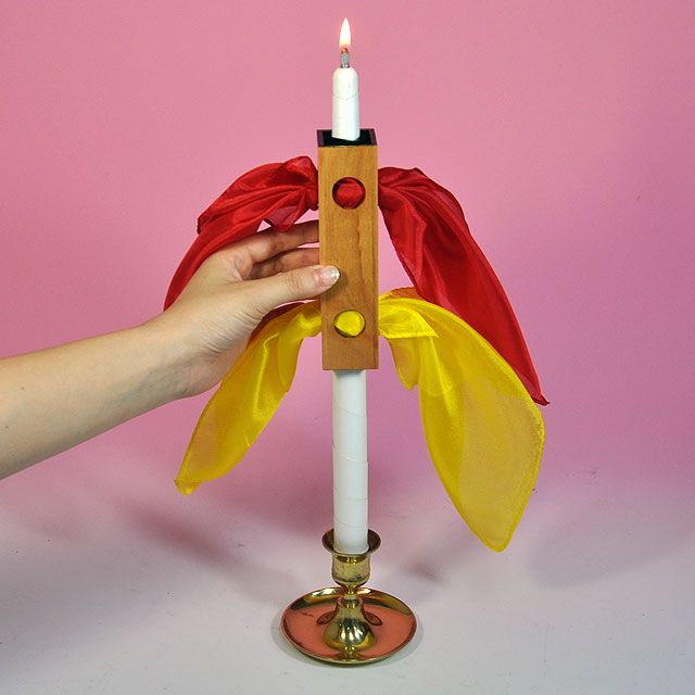 小さな四角い木製の筒(一辺が35mm角、長さ135mm)の中をよく見せます。筒は左右2カ所と正面に直径2cmほどの穴が開いています。そして、左右2カ所の穴に2枚のシルクを通します。正面の穴から、確かに穴の内側いっぱいの状態でシルクが通っているのがはっきりと見えます。そこで長めのキャンドルに火を点け、シルクの通っている筒に通します。キャンドルは火の点いた状態のまま筒の中を通り抜け、シルクをも貫通して上から顔を出します。キャンドルを抜き取り、筒からシルクを抜き出して見せますが、シルクには焼けこげはおろか、傷1つ付いていません。再び筒の中をよく見せますが怪しいところは見あたりません。筒の中に仕掛けられた巧妙な仕掛けでどなたでも手軽に演じられます。(キャンドルとシルクは付いていません)また「バニシングキャンドル」(Q6423他)等のキャンドルトリックとの併用も効果的です。
