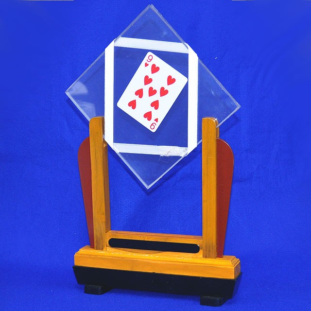 マジシャンは2枚の透明板(19cm角)を、木製のスタンド(幅・高さ共22.5cm)に立てておきます。(透明板を乗せた高さ39cm)お客様に1組のトランプ(デック)から1枚を選んでもらい、デックに戻してから、デックをスタンドに向かって投げつけます。するとその瞬間、透明板の間にお客様の覚えたカードがはさまってしまいます。さらに、「DPGネオジウムカードボックス」(I6233)・「プラ製 カードトリポット」(I5823)等を利用すれば、覚えたカードを破いてもらい、その1片をお客様に預けておくと、1片の欠けたカードが復活して透明板の間に出現し、お客様の持った1片とピタリ一致するといった、演出効果抜群の手順も可能です。オーソドックスなタイプの製品で、簡素化されたメカニックによってトラブルの心配もありません。これぞ、お薦めのステージ用カードマジックの傑作です。(トランプは各自ご用意下さい)<似た製品に、優れた機構を取り入れたプラスチック製の「DPG TVカード」(I7710)他もございます。>