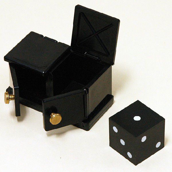 サッカートリックの傑作「Die Box」をクロースアップで演じられる、かわいいミニチュアサイズの製品です。前面と上面に2つずつ扉の付いたプラスチック製の小箱(奥行35mm・横67mm・高さ36mm)を開けて、2つに仕切られた部屋を見せ、その一方にプラスチック製のダイス(1辺25mm)を入れます。さあ、ここから面白いことが起こります。お客様に箱のどちらの部屋にダイスが入っているか当ててもらいますが、指定した方の部屋にはダイスはありません。それもそのはず、マジシャンは箱を傾けてダイスを反対側にスライドさせているようです。お客様にスライドする音さえ聞こえてきます。そこで、お客様は両方の扉を開けて全ての部屋を見せるように言います。マジシャンは前と上各々全ての扉を開けて見せますが、ダイスは跡形もなく消え失せています。そして、ダイスは全く思いがけない所から現れるのです。