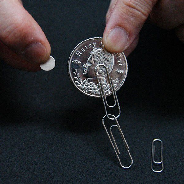 おなじみの「フーディニーコイン」(O2000)を使用し、最先端の金属加工マシンで製作されたギミックコインのシリーズです。その中でもたいへん応用範囲の広いトリック、それが「マグネチックコイン」です。例えば、コインを空中に投げ上げて消してしまったり、コインがテーブルを貫通したり、封筒に入れたコインがお客様の目の前で封筒から忽然と消え失せたり(フーディニーは世紀の脱出王でした。)、他にも、グラスの口に乗せたカードを貫通して、コインがグラスの中に入ってしまう…等々、摩訶不思議な現象を難しいテクニックを使うことなく、次から次に演じることができるのです。
