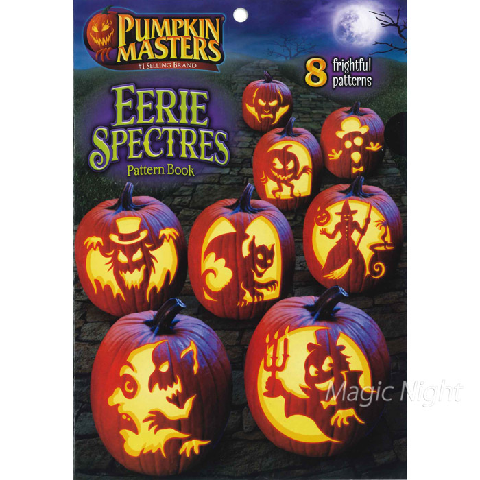 かぼちゃのくりぬき方(英語表記)と、8種類のデザインが描かれているパターンブックです。