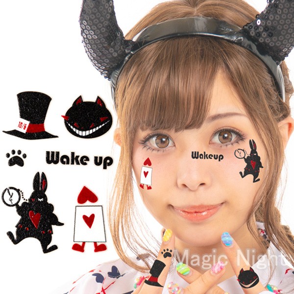 不思議の国のアリスみたいな、シルクハット、キャット、うさぎ、トランプ兵のモチーフが可愛いグリッターフェイスシール。ハロウィンコスプレ(仮装)に、コスチュームと合わせればとっても可愛いですよ!