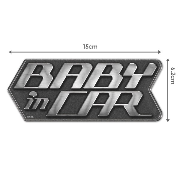 自動車のリアについているようなロゴをイメージした、トリックアート風「BABY IN CAR」テキストデザイン。キラリと光るメタリック風にデザインされた質感がかっこいい、マグネットパーク限定オリジナルデザインの車マグネットステッカーです。