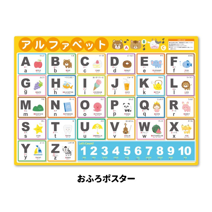 お風呂でアルファベットのABCを覚えよう!おふろポスターにアルファベット表が登場しました。お風呂に貼ってABCを学習できるマグネット製ポスターです。 ■商品サイズ:約570×約400mm ※本製品はマグネットを使用しています。ご使用になる壁面に磁石がつくかどうか、あらかじめご確認ください。 |