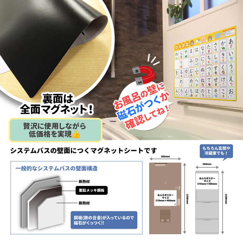 | ●本製品はマグネットを使用しています。ご使用になる壁面に磁石がつくかどうか、あらかじめご確認ください。 ●本製品の裏面(マグネット面)が壁面に密着するように貼ってください。 ●長期間のご使用など、使用環境により本製品と壁の間や周囲にカビが発生する場合があります。浴室の清掃時などに外して水分を拭き取ってください。 ●保管中の製品の反りやシワがご使用時に戻りにくい場合は、浴槽やシャワーのお湯などにつけて温めてからご使用ください。製品がやわらかくなり壁面などに貼りやすくなります。 ●本製品の水分をタオル等で拭き取る際には強くこすらないでください。 ●浴室の清掃時等に、本製品に洗剤等がかからないようにしてください。 ●浴室乾燥機使用時は本製品を取り外してください。 ●本製品を火気などの熱源の近くに置かないでください。 ●お使いのモニターにより、写真と実物とでは、多少、色合いが異なって見える場合がありますのでご了承下さい。 |