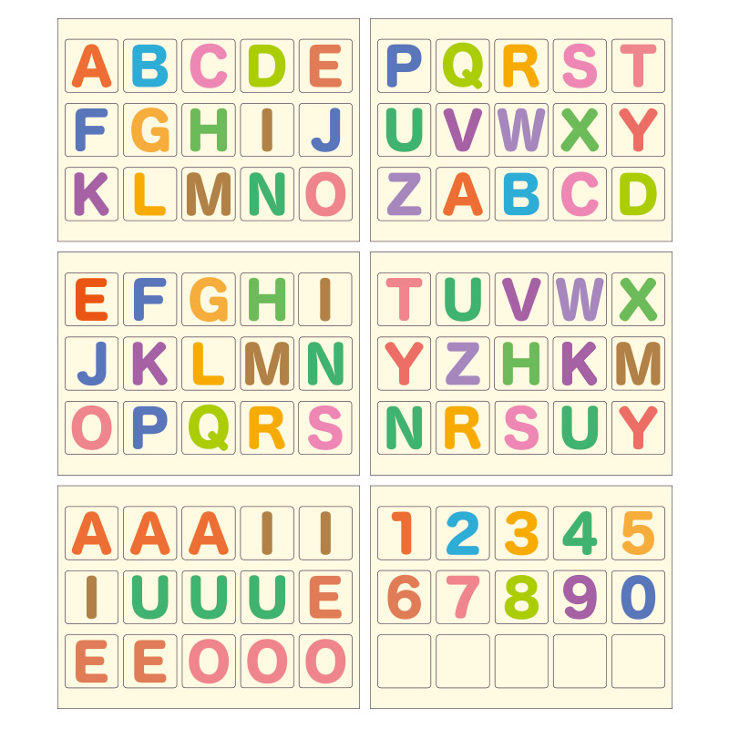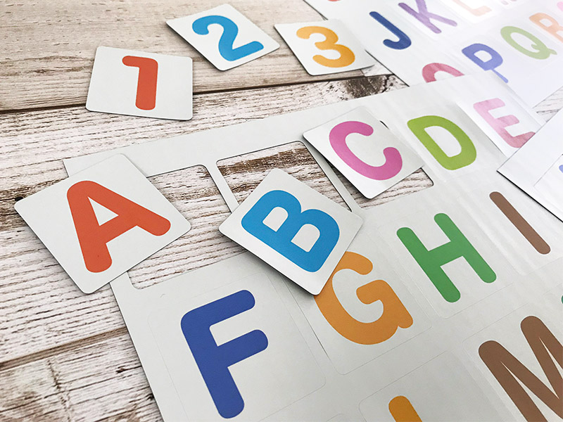 アルファベットと数字で計90枚のパーツになっています。母音やよく使われる子音は複数枚ご用意。一枚ずつ切り離せるので、いろいろな使い方ができます。使い方を考えてみるのも楽しい!余白のカードもあるので、自由に使ってください。