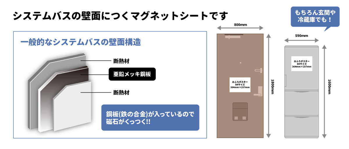 おふろの壁以外では、冷蔵庫や玄関ドアに貼るのもおすすめです。