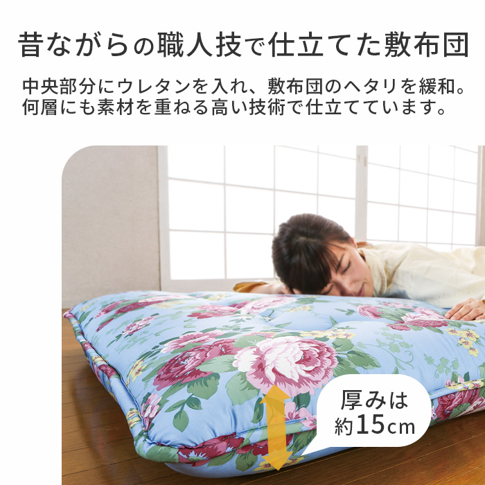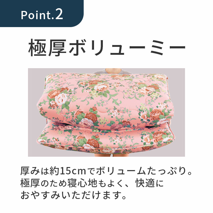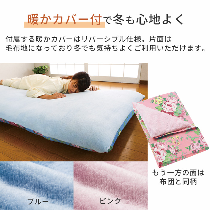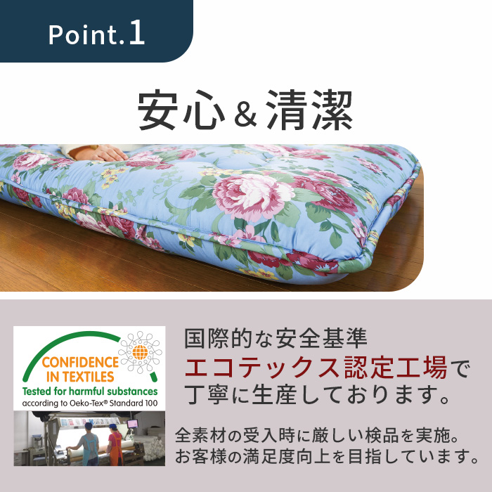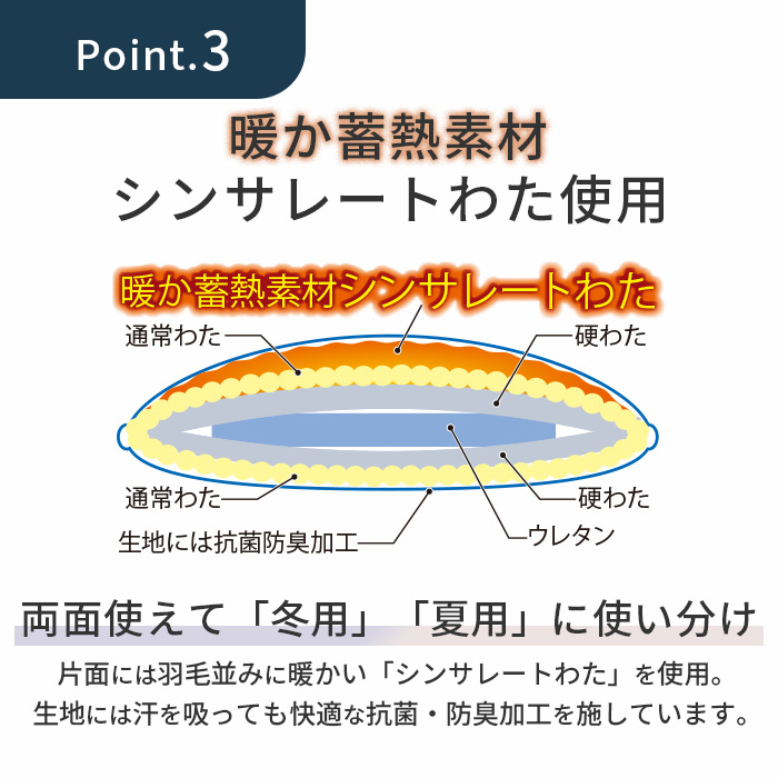 | 素材 | 側地/抗菌・防ダニ加工綿混(ポリエステル85%・綿15%) 中わた/ポリエステル100%、中芯/硬わた・ウレタン・片面シンサレート入り (付属品)暖かカバー/ 片面ポリエステル毛布、片面ポリエステル80%・綿20% |