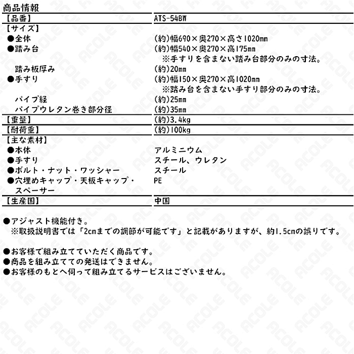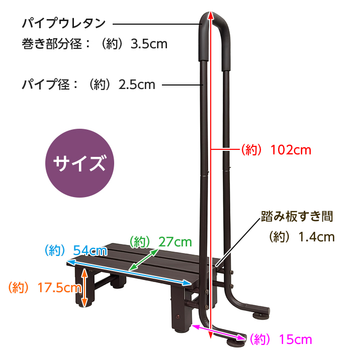 | 製品サイズ(約) | 幅69×奥27×高さ102cm [踏み台] ※手すりを含まない踏み台部分のみの寸法。 (約)幅54×奥27×高17.5cm 踏み板厚み:(約)2cm [手すり] ※踏み台を含まない手すり部分のみの寸法。 (約)幅15×奥27×高102cm パイプ径:(約)2.5cm パイプウレタン巻き部分径:(約)3.5cm |