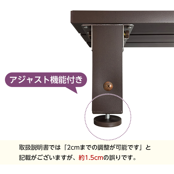 | 【商品に関する注意点】 | (重要)離島と沖縄にはお届けできません。 ●アジャスト機能付き。 ※取扱説明書では「2cmまでの調節が可能です」と記載がありますが、約1.5cmの誤りです。 ●お客様で組み立てていただく商品です。 ●商品を組み立てての発送はできません。 ●お客様のもとへ伺って組み立てるサービスはございません。 ●商品仕様はメーカー発表を基にしています。 ●本来とは異なる方法や用途以外で使用したり改造したりするなどせず、正しく使用してください。 ●商品仕様は改良のため予告なく変更される場合があります。 ●画像はご覧頂く環境(ディスプレイやご利用端末の違い、設定など)や撮影時の角度や光の当たり具合などにより、実際の色味と異なって見える場合がございます。 ●こちらの商品はメーカーの在庫を共有しており、メーカー側の在庫更新のタイミングによっては実際には在庫切れとなってしまっているという場合があります。その場合やむを得ずキャンセルさせて頂く場合があります。 上記につきまして予めご理解ご了承頂きますようお願い申し上げます。 |