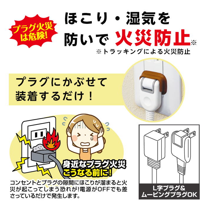 | 注意点 | ●本品はコンセントとプラグの隙間にホコリの侵入を防ぎトラッキング現象の対策ができます。 ●ストレートプラグ、L字プラグ、ムービングプラグに使用できます。 ●異形のプラグには使用しないでください。 ●しっかり差し込めずプラグが浮くなど形が合わないものは使用しないでください。 ●濡れた状態、または濡れた手で取り付けや取り外しは行わないでください。 ●破損や劣化が生じた場合は使用を中止してください。 ●破れた場合は強い力で引っ張らないでください。 ●本品はトラッキング現象による電気火災の完全な防止を保証するものではありません。 ●本品使用の際はコンセント周りの定期的な掃除が必要です。 ●小さなお子様やペットが口に入れないようご注意ください。 ●使用しない時は乳幼児等の手の届かない場所に保管してください。 |