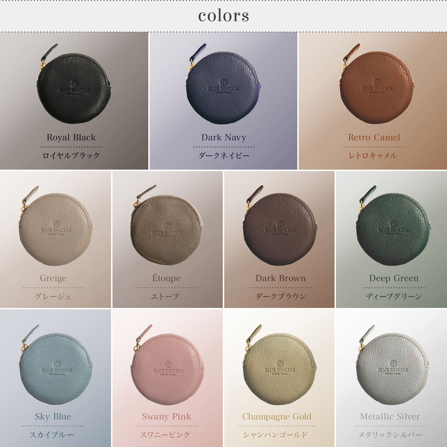 カラー:ロイヤルブラック・レトロキャメル・シャンパンゴールド・ダークブラウン・グレージュ・ディープグリーン・ダークネイビー・スカイブルー・メタリックシルバー・スワニーピンク