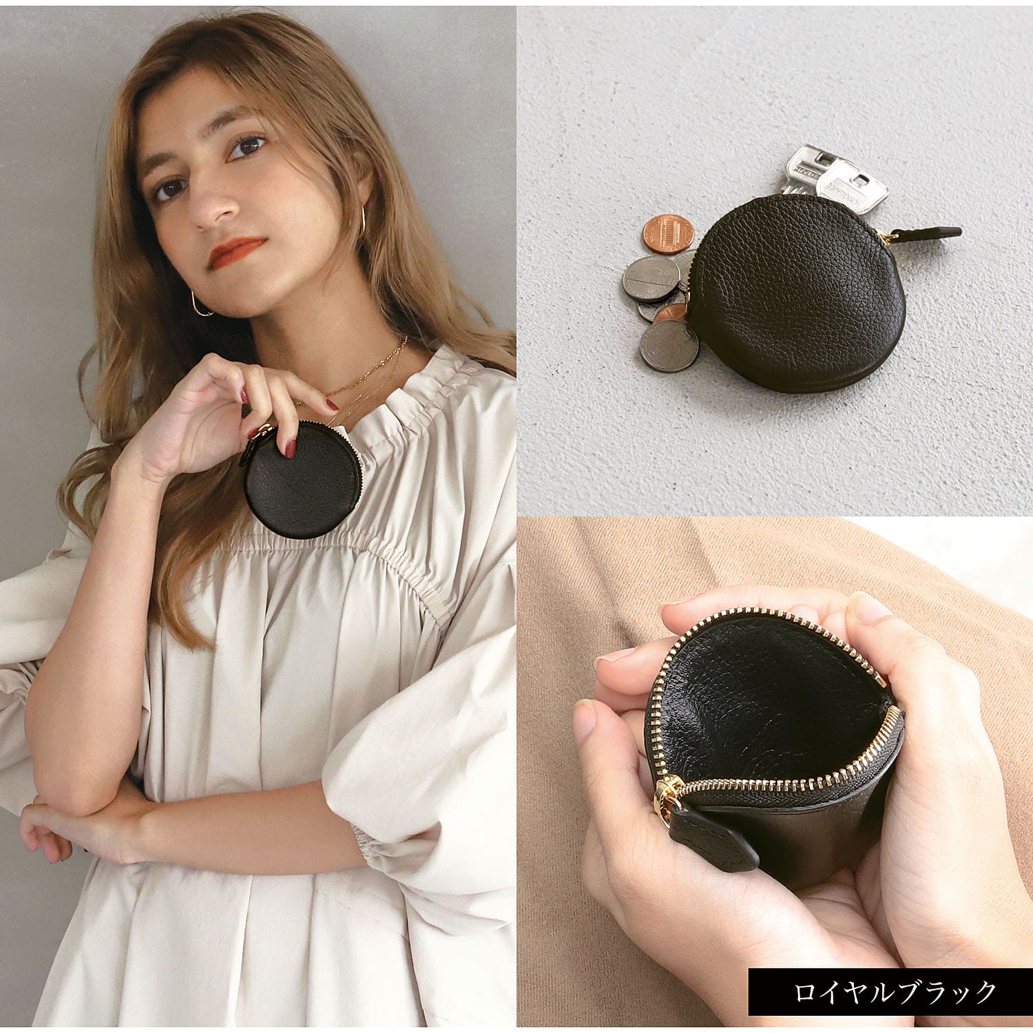 【 ガバッと開く開口部 】 小銭やお札だけでなく、ピアスやネックレス、指輪など小物系を収納し、