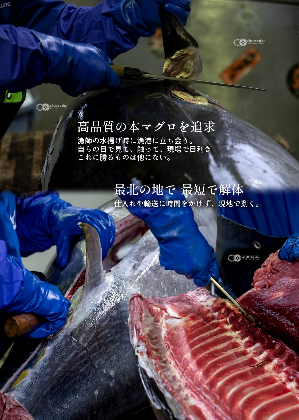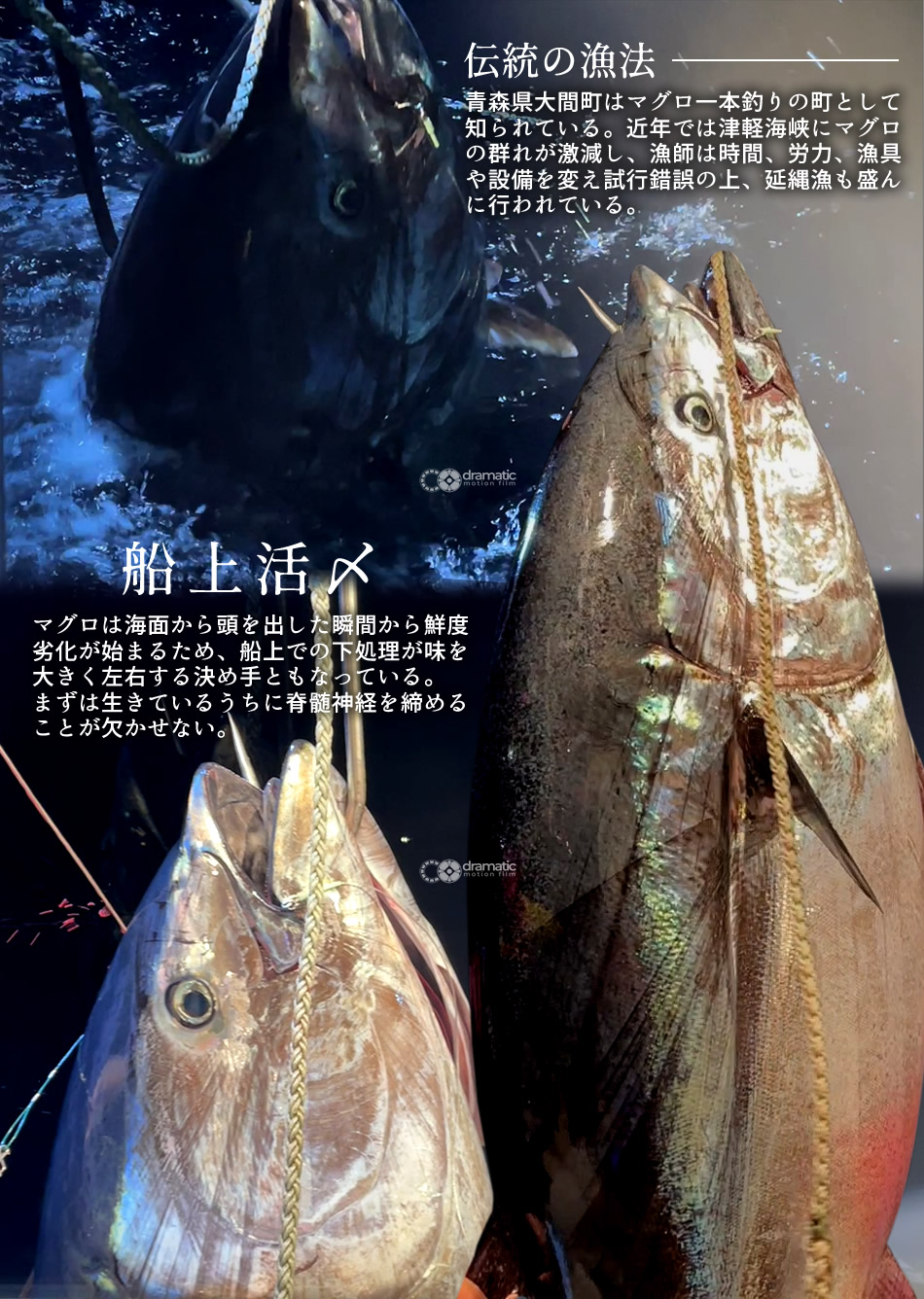 日本屈指の本マグロ(クロマグロ)の聖地、青森県大間町。赤道近海で産卵されたマグロは黒潮などの暖流にのり、エサを求めて北上し、津軽海峡近海に夏から冬にかけて回遊します。マグロの主食ともなるイカは、青森県の言わずと知れた大産地であり、脂がのった良質な本マグロが豊洲市場の目利き人にも高く評価されています。