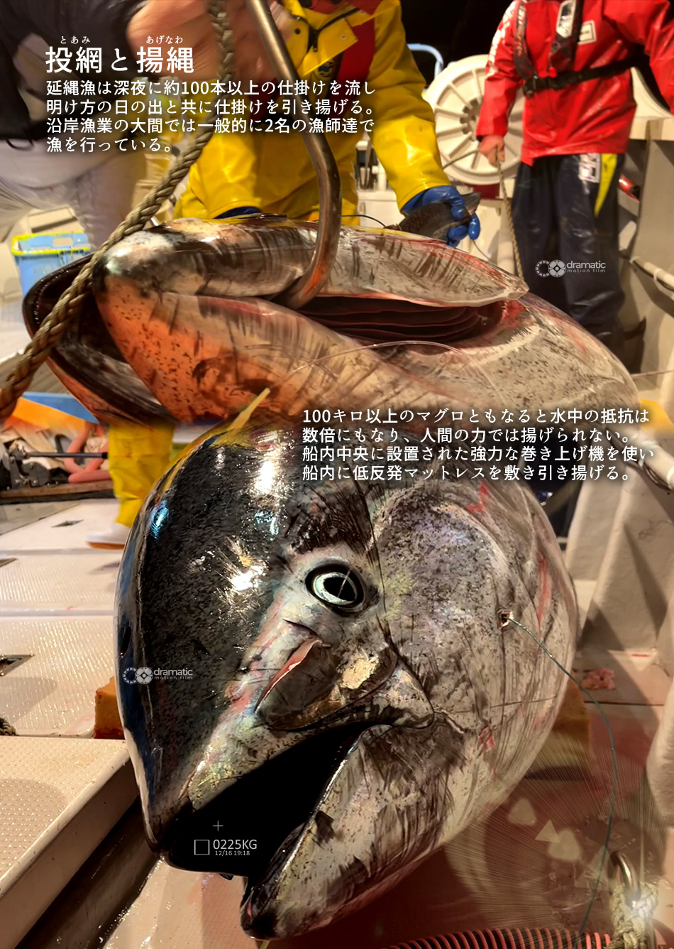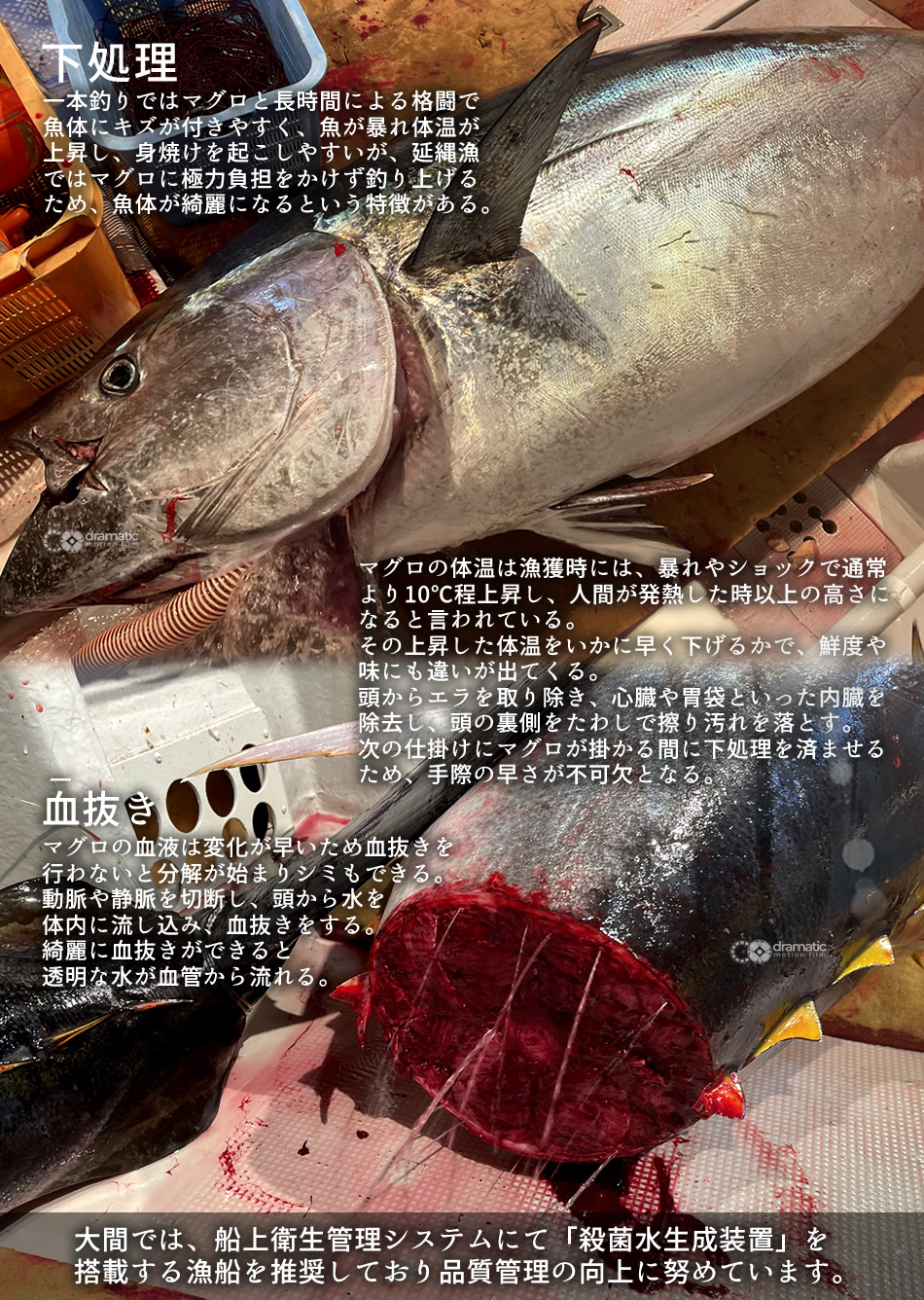 大間港に水揚げされるマグロは約10年以上もの間、泳ぎ続けてきた100kgから200kgに及ぶ特大級の重量となり、大間の漁師達は荒波の時化の中でも体を張って釣り上げています。また遠洋鮪とは異なり、日帰りで漁獲できるため、大間産マグロは冷凍されず市場に流通するという特徴があります。