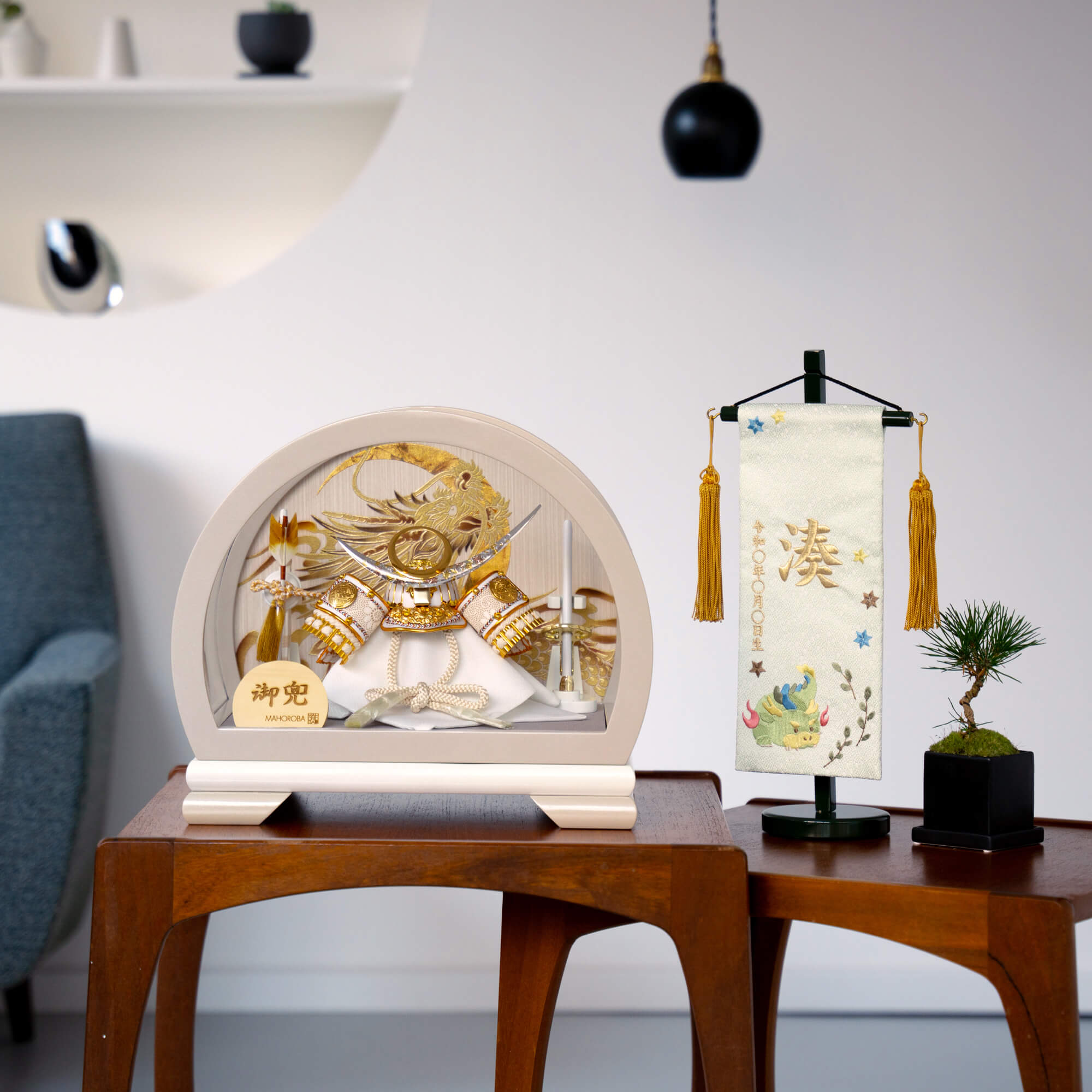 五月人形 兜 コンパクト おしゃれ モダン 木 人気 インテリア 木製 高級 兜飾り月龍 5号 兜ケース グレー 清秀作 上杉白 名入れ 木札付き 日本製