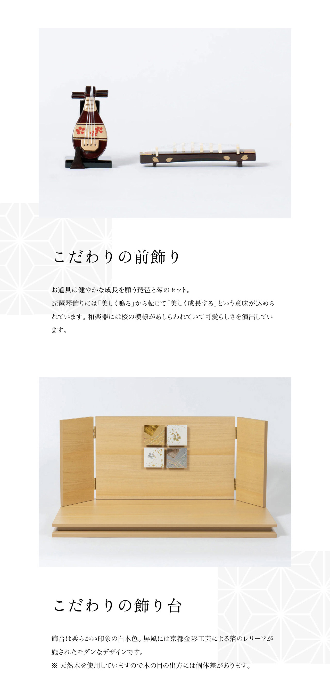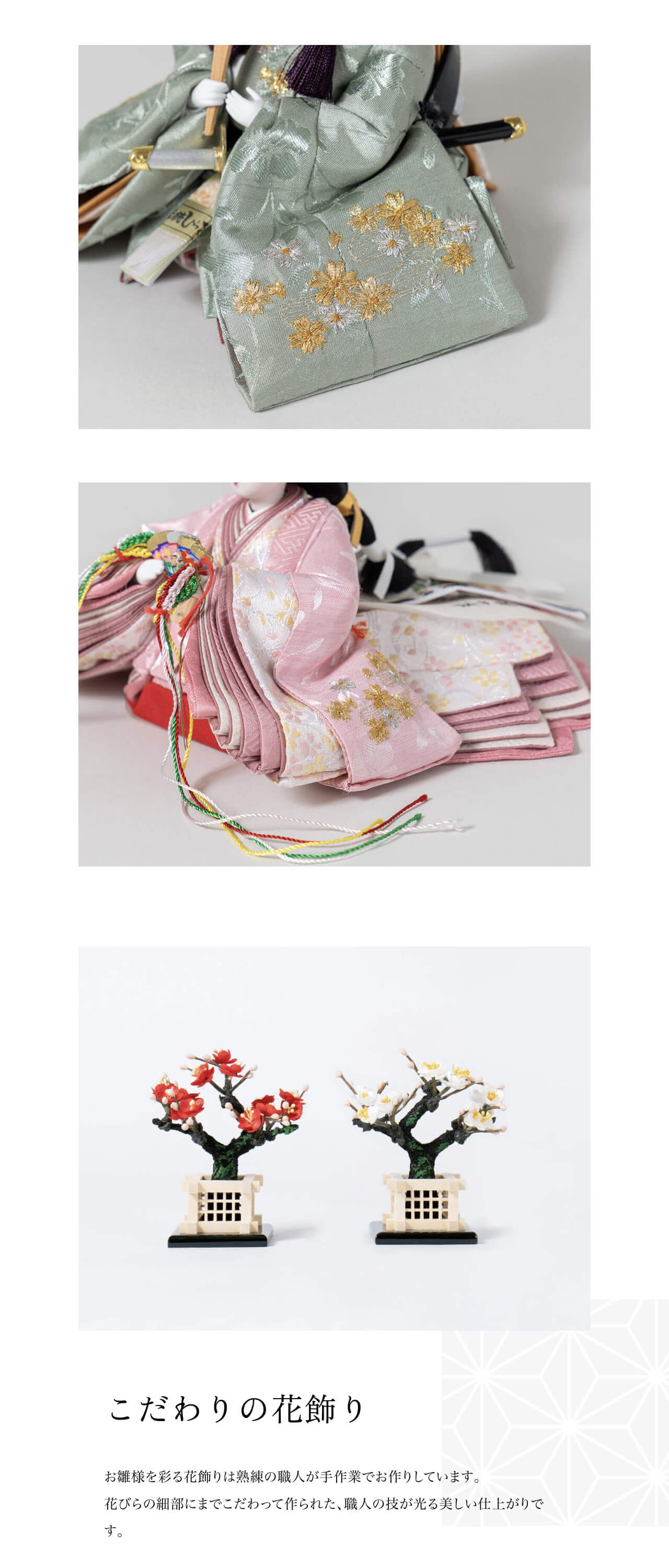 雛人形に、生まれたばかりの子が災いを避け健やかに育つように、という願いを込めて毎年飾ります。