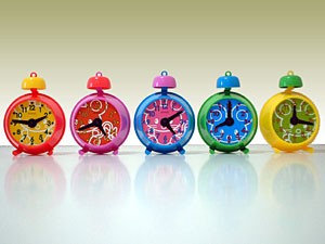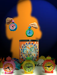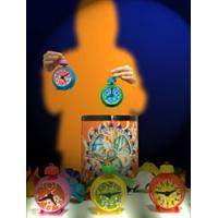 空っぽの筒から、カラフルな目覚まし時計が続々と出てくる演技が可能です。