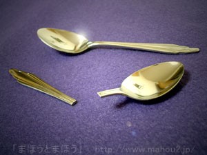 スプーンは後で調べさせても、ごく普通のスプーンにしか見えませんので、例えばパーティー等のスプーンに混ぜておき、いかにも思いつきで演じたように見せると・・・皆の強烈な反応は容易に想像がつくかと思います。