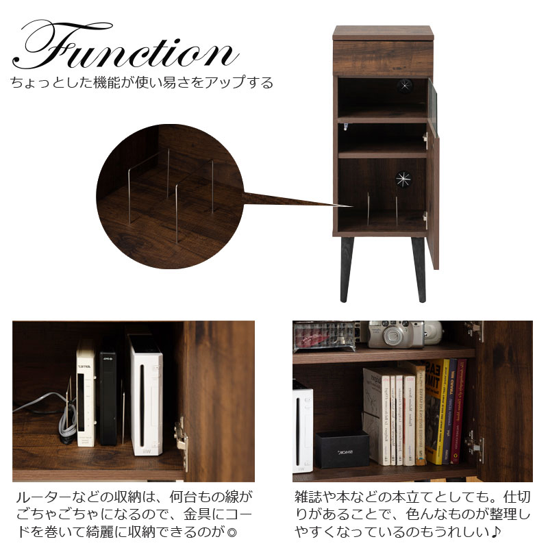 ■商品について/西海岸インテリアに『ARIZONA』シリーズが新登場!ヴィンテージ感漂う深みのあるブラウンをベースに透明感あるクリアガラスやスキニーな美脚効果で軽やかでスタイリッシュなデザインに仕上げたFAX台兼用キャビネット。スリムな約30cm幅はデッドスペースや玄関などにちょいっと置けるおしゃれなキャビネット。扉内にはごちゃつきがちな配線や野暮ったいルーター機器などを隠してしまえる実力派。ガラス部には雑貨などをディスプレイして好みの雰囲気にアレンジ。ワイド約60cmタイプはリビングなどスピーカー台やFAX台としてコンパクトでお洒落に演出。重厚感あるカラーリングに薄型で絶妙なサイズバランスはARIZONAの真骨頂。 ■商品の仕様/本体:強化プリント紙化粧繊維板、脚部:天然木ラバーウッド(水性塗装)、強化ガラス ■商品サイズ/本体:(約)幅30.5×奥行30×高さ80.5(脚部20含む)cm ■引出し内寸/(約)幅23.5×奥行24.5×深さ6.5(有効8)cm ■扉内寸/上部:(約)幅26.5×奥行26×高さ12cm、下部:(約)幅26(有効26.5)×奥行26×高さ31(有効32)cm ■棚板/可動式1枚(6cmピッチ・3段階) ■耐荷重量/天板:(約)10kg、棚板:(約)5kg ■商品重量/(約)10kg ■組立品 |