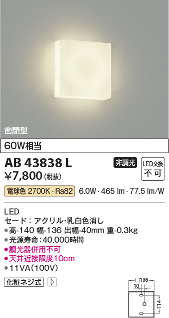 コイズミ照明 AB43838L 薄型ブラケットライト 白熱球60W相当 LED一体型 電球色 乳白色