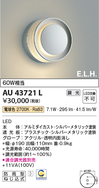 コイズミ照明 AU43721L ポーチライト ブラケットライト E.L.H. 調光タイプ LED一体型 電球色 シルバー 防雨型 白熱球60W相当