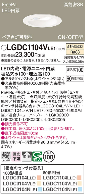 パナソニック LGDC1104VLE1 ダウンライト 埋込穴φ100 LED(温白色) 天井埋込型 高気密SB形 明るさセンサ付 ホワイト